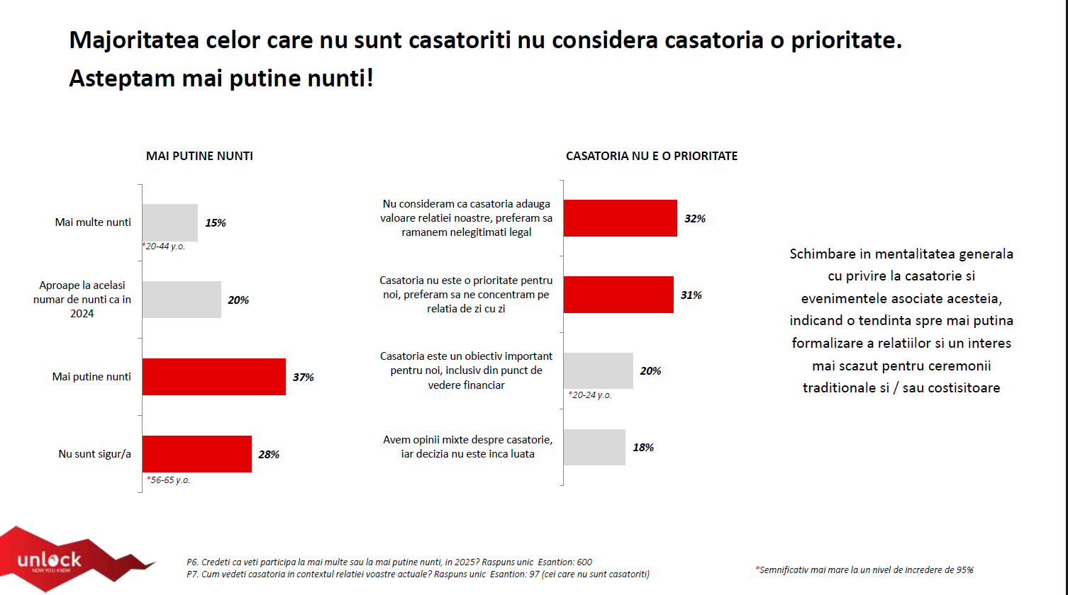 „Tinerii evită tot ce li se pare învechit din punct de vedere tradițional și nu le aduce un beneficiu imediat. De asemenea, se tem ca relația lor să nu fie influențată de aspecte tranzacționale și nu vor ca nunta să devină un spectacol sau un troc. De aceea, nu resping căsătoria în sine, ci mai degrabă ideea de nuntă”, a declarat Adina Vlad, sociolog și fondator Unlock Market Research.