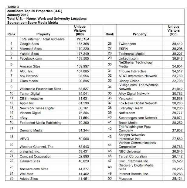 Este de notat ca in top Facebook se afla sub site-urile Yahoo si Microsoft. Site-urile detinute de Google sunt in top, fara indoiala “impinse” de la spate de YouTube, scrie Webpronews.com.
