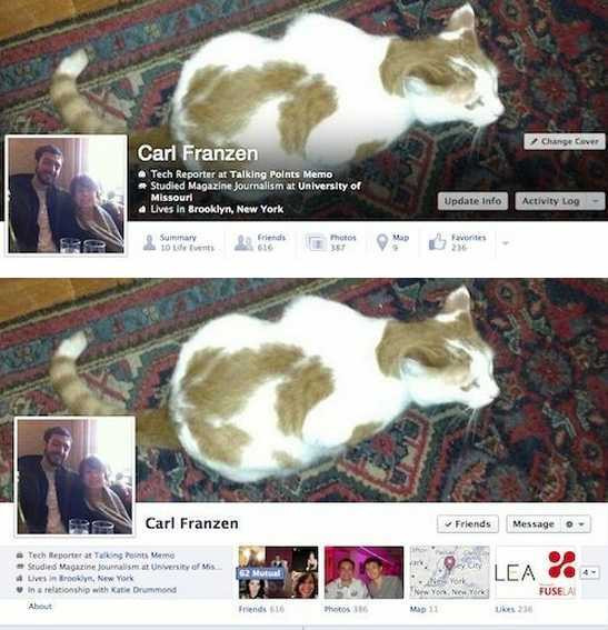 “Noul Timeline” testat de Facebook include o compresie a elementelor de profil, iar o parte dintre ele urmeaza sa fie afisate direct pe poza principala (cover photo - n.r.), datele despre utilizator, prezente pana acum sub poza de profil, fiind mutate astfel direct pe poza principala, ca in fotografia de mai jos.