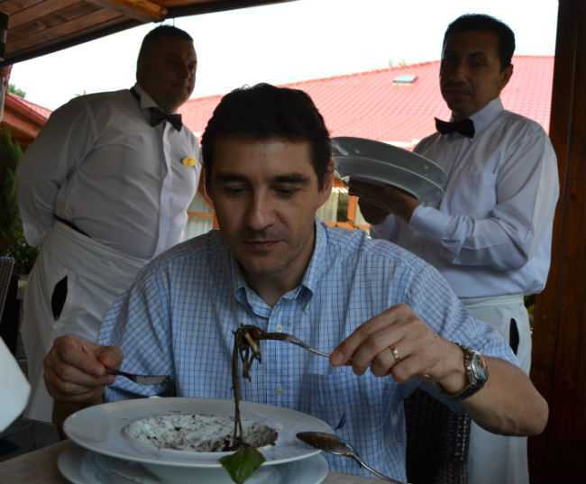 Intre timp vine un chelner catre noi. Cristian il roaga sa il ajute privind o decizie, ce ii recomanda pe ziua respectiva. “Un peste bun, daca doriti. Plus ceva la inceput, bineinteles, un tartar…”, spune el. Eu sunt hotarat asupra unor paste cu fruce de mare, in timp ce Cristian se hotaraste asupra unui Nero di Sepia.