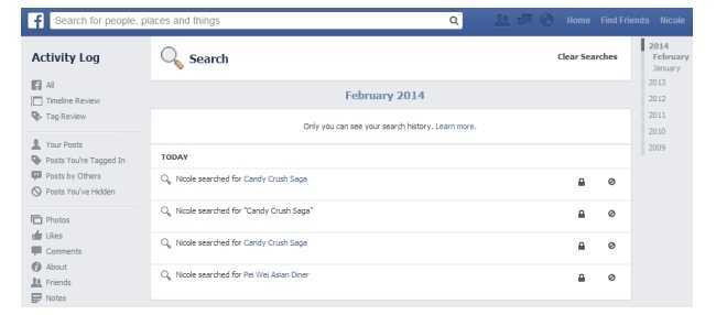 Pasul 3: Va aparea intreaga activitate derulata pe Facebook in ultimul timp, iar de aici vor putea fi inlaturate cautarile individuale, printr-un click pe o iconita de culoare neagra. Daca va doriti sa stergeti intreagul istoric al cautarilor selectati Clear Searches.