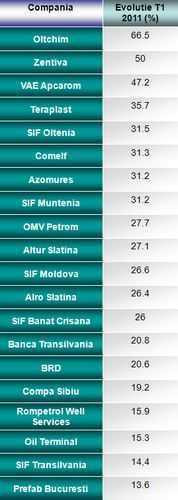 Oltchim Ramnicu Valcea (OLT) si Zentiva (SCD) ocupa primele doua pozitii in topul cresterilor pe Bursa in T1 2011, actiunile celor doua companii inregistrand aprecieri de 66%, respectiv 50%. Daca in cazul Zentiva dividendele record oferite au reprezentat motorul evolutiei pozitive, situatia Oltchim, companie cu pierderi de peste 50 milioane euro in 2010, este diferita. Posibila privatizare anuntata de Guvern la inceputul anului a fost puternic speculata pe BVB, investitorii considerand ca statul va fi nevoit in cele din urma sa vanda compania, la presiunile Fondului Monetar International.