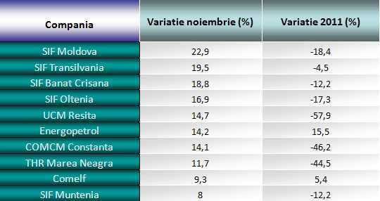 Tot la capitolul scaderi merita remarcate si titlurile Erste Bank (EBS), acolo unde SIF-urile au primit si urmeaza sa mai primeasca actiuni in schimbul detinerilor BCR. Titlurile EBS au pierdut 17,3% pe bursa romaneasca in noiembrie.
