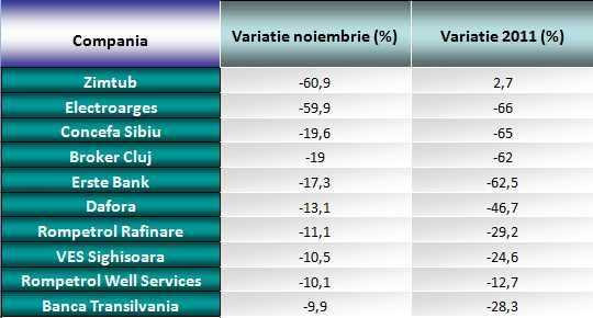 Cele mai tranzactionate zece actiuni din piata au pierdut in medie 7,2% in noiembrie, Zimtub (ZIM) fiind lider la acest capitol, cu o pierdere de 60,9%. Producatorul de tevi a anuntat in noiembrie ca se va retrage de pe Bursa. In lunile precedente, actiunile Zimtub crescusera puternic, dupa anunturile privind pretul de retragere oferit actionarilor.