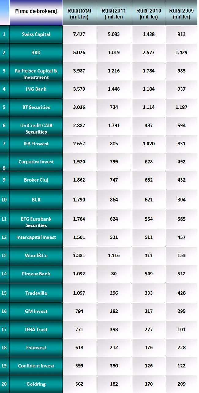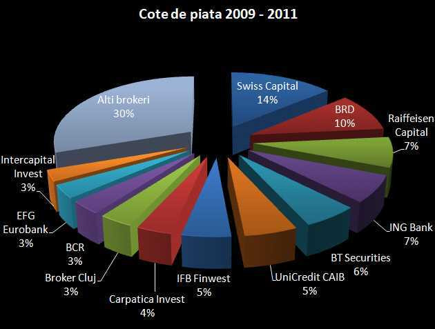 Swiss Capital (fosta KBC Securities) are cel mai mare rulaj intermediat – 7,4 miliarde lei in perioada 2009 – 2011 si o cota de piata cifrata la 13,9%. Celelalte doua pozitii ale podiumului sunt ocupate de BRD si Raiffeisen Capital & Investment.