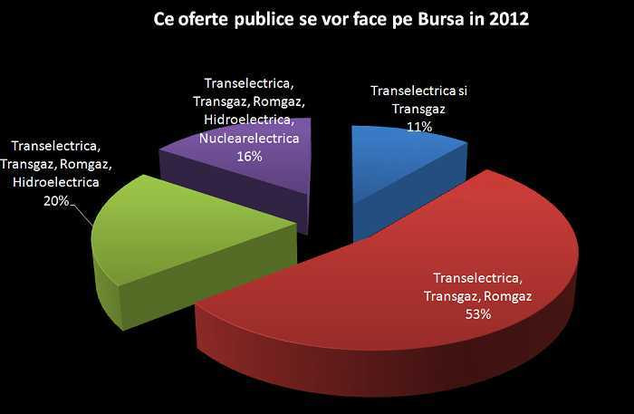 24 dintre cei chestionati spun ca statul roman va face in acest an oferte publice la Transelectrica, Transgaz si Romgaz. Alti noua brokeri si analisti au mai adaugat si Hidroelectrica pe aceasta lista, in vreme ce doar cinci participanti cred ca reprezentantii Guvernului se vor tine de cuvant si vor face toate ofertele publice anuntate pentru 2012.Brokerii dau sanse minime si privatizarii Oltchim in 2012, mutare intens speculata pe Bursa in ultimele luni, si care anul trecut a urcat pretul actiunilor OLT cu peste 400%.