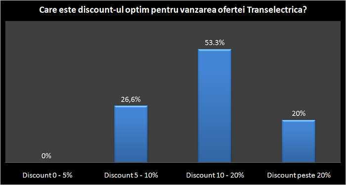 53% din participantii la sondaj considera ca actiunile Transelectrica ar trebui sa fie vandute la un pret cu 10 – 20% mai mic decat cel inregistrat in piata la momentul anuntului pentru ca oferta sa fie subscrisa in proportie de 100%.