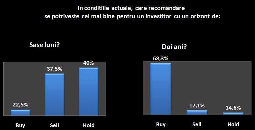 Lucrurile se schimba insa atunci cand vine vorba de recomandarile pentru investitorii pe termen lung, cu un orizont de cel putin doi ani. 68% din brokeri le recomanda acestora sa cumpere, in vreme doar 31% dintre participantii la sondaj au recomandat “sell” sau “hold”.