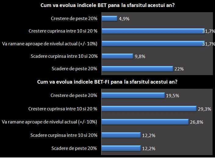 In privinta estimarilor pe BET si BET-FI, principalii indici ai Bursei de la Bucuresti, estimarile sunt usor optimiste. Cei mai multi dintre respondenti (circa 30%) se asteapta la cresteri de 10 – 20% pe cei doi indici pana la sfarsitul anului. De asemenea, o parte importanta dintre brokeri (27%) spun ca SIF-urile vor avea o evolutie orizontala in restul anului (+/-10%).