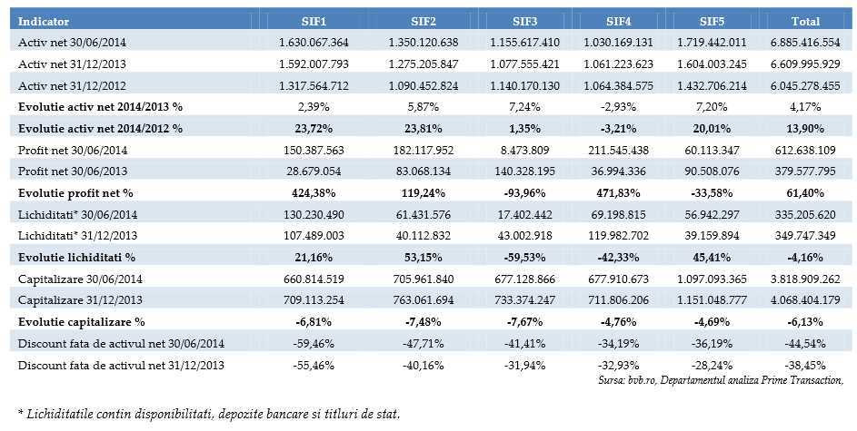 SIF-urile inregistrau cresteri de pana la 7,24% ale activului net (cazul SIF Transilvania), comparativ cu inceputul anului. SIF Muntenia a fost singura societate a carei activ a scazut in primul semestru cu 2,93%. Activele nete cumulate ale SIF-urilor au crescut cu o rata de 4,17% fata de inceputul anului. Fata de finalul lui 2012, cele mai mari aprecieri ale activului net au fost inregistrate de SIF Moldova, SIF Banat-Crisana si SIF Oltenia, ratele de crestere fiind de 23,81%, 23,72%, respectiv 20,01%, potrivit calculelor Prime Transaction.