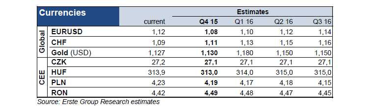 Analistii Erste mizeaza pe un curs de 4,49 lei/euro in trimestrul al patrulea, cu 1,8% peste nivelul actual de 4,413 lei/euro. De altfel, estimarile acestora pentru toate valutele din regiune (zlotul polonez, forintul maghiar, coroana ceha) anticipeaza deprecieri modeste.