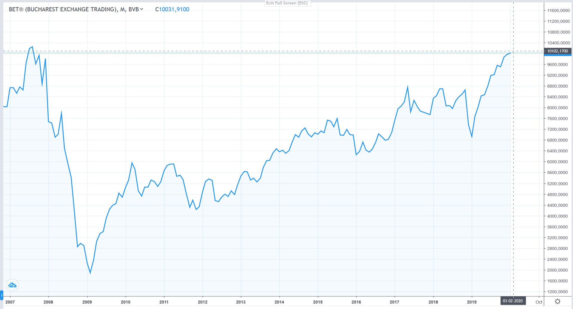 Bursa de Valori Bucuresti a atins maximul istoric in iulie 2007, criza care a urmat in urmatorul an spulberand castigurile investitorilor si aruncand atat bursa locala cat si pietele internationale intr-o cursa de recuperare ce a durat mai bine de un deceniu.
