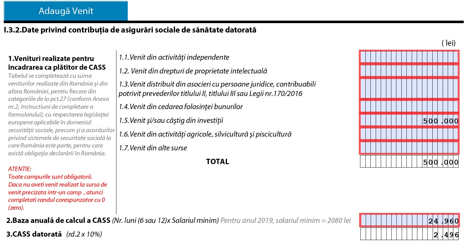 În cazul în care veniturile le-ați realizat în anul 2019 CUMULAT din una sau mai multe surse și/sau categorii de venituri menționate de prevederile fiscale, au fost mai mari decât plafonul de 12 salarii minime brute pe țară (24.960 lei), veți completa Subsecțiunea I.3: Date privind contribuția de asigurări sociale (CAS) și contribuția de asigurări sociale de sănătate(CASS), Subsecțiunea I.3.2 Date privind contribuția de asigurări sociale de sănătate (CASS) datorată. În caz contrar nu se completează.