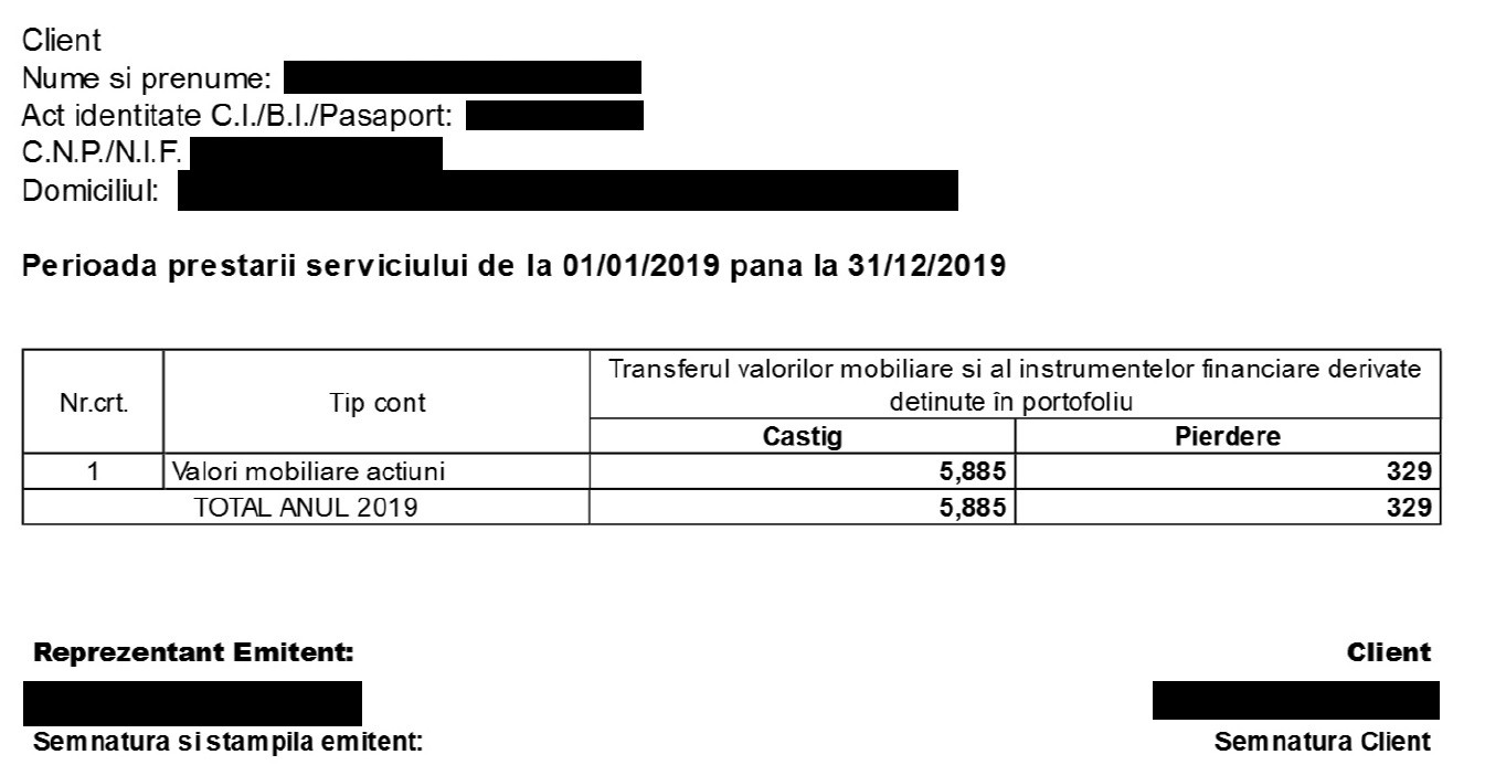 Pentru a completa unul dintre aceste două puncte veți avea nevoie de Fișa de Portofoliu (vezi exemplul de mai jos) furnizată anterior de casa de brokeraj al cărei client sunteți. Bazându-va pe informațiile din Fișă, veți putea calcula dacă în anul 2019 ați avut o pierdere sau un câștig net ca urmare a tranzacțiilor realizate pe bursă. În exemplul de mai jos, investitorul a avut în 2019 câștiguri de 5.885 lei și pierderi de 329 lei, ceea ce înseamnă că la nivelul întregului an a înregistrat un câștig net de 5.556 lei, sumă care trebuie completată în Declarația Unică.