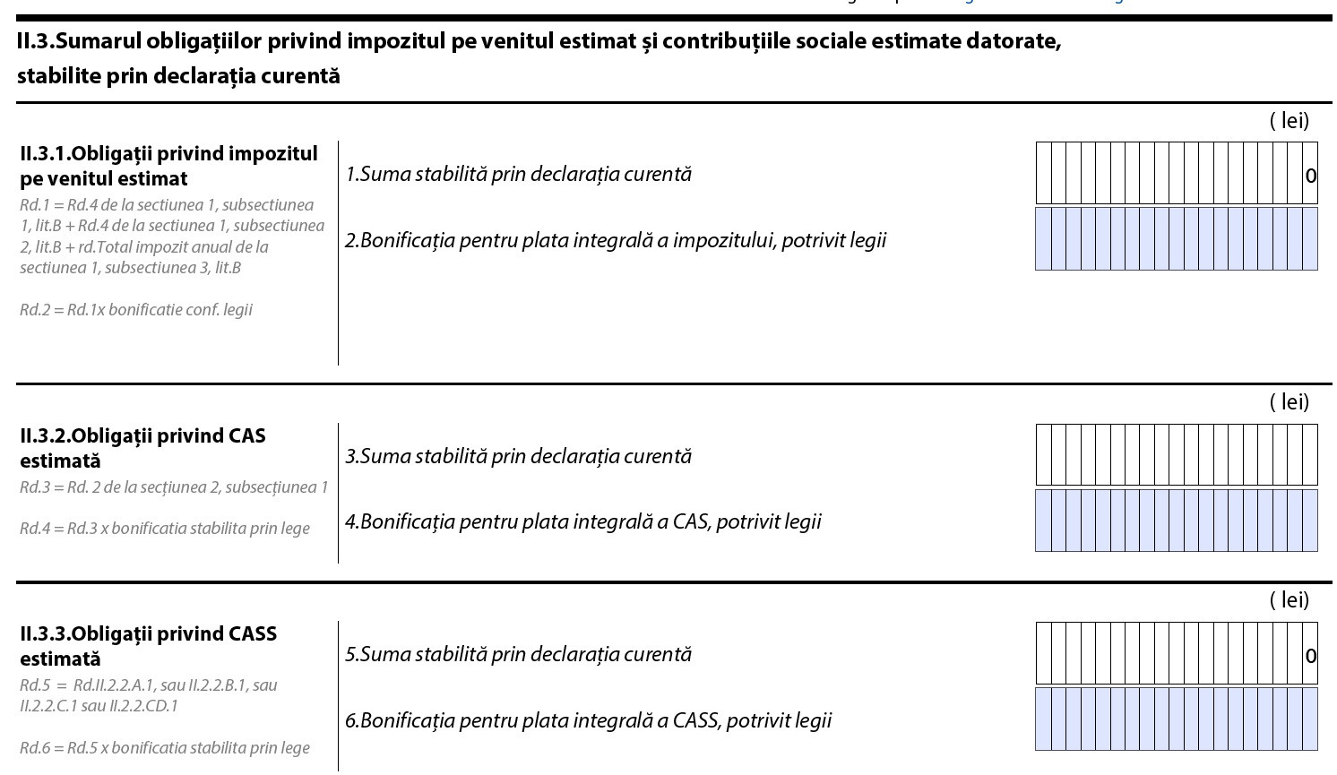 În cazul în care considerați că veniturile dumneavoastră în anul 2020, CUMULAT din una sau mai multe surse și/sau categorii de venituri menționate de prevederile fiscale vor fi mai mari decât plafonul de 12 salarii brute pe țară (26.760 lei), veți completa Secțiunea II.2 Date privind contribuția de asigurări sociale (CAS) și contribuția de asigurări sociale de sănătate estimate (CASS), Subsecțiunea II.2.2 Date privind contribuția de asigurări sociale de sănătate estimate. În caz contrar nu se completează.