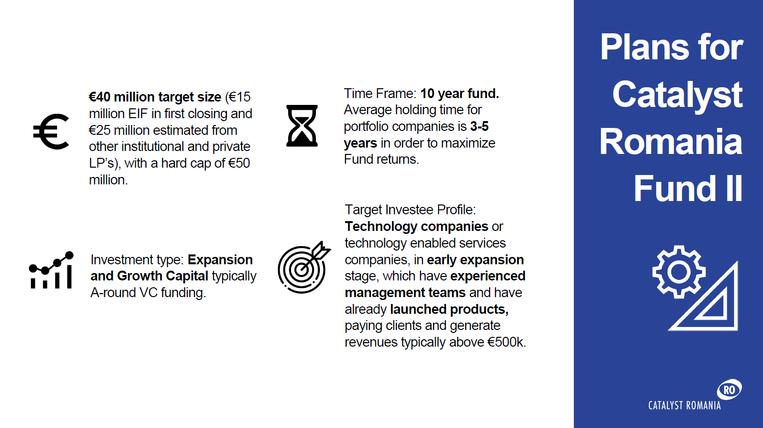 Catalyst România II va continua să vizeze companiile de tehnologie care au deja un istoric de produse lansate pe piață și echipe de management cu experiență. În perioada inițială de investiții, noul fond va investi într-un număr de 16 companii românești, cu scopul de a le sprijini obiectivele de creștere și extindere internațională.