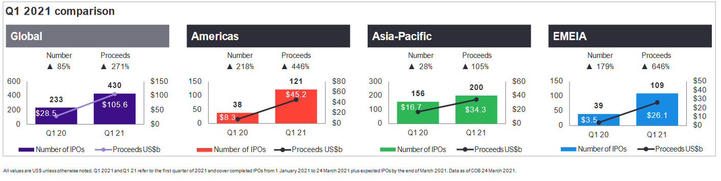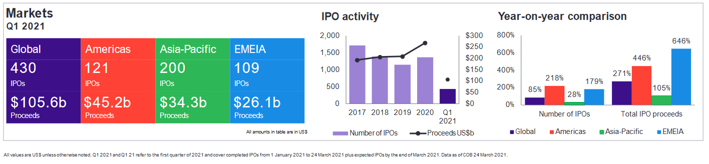 Perioada de rezistență la șocuri a regiunii Americii de Nord și de Sud a continuat în T1, când s-au realizat 121 de tranzacții și venituri în valoare de 45,2 miliarde de USD. Per total, bursele din regiune au înregistrat cel mai mare număr de tranzacții și cele mai mari venituri cumulate din ultimii peste 20 de ani. În regiunea Asia-Pacific, s-au înregistrat cele mai mari venituri generate de ofertele publice inițiale din ultimii 20 de ani, efectuându-se 200 de tranzacții IPO, care au atras capitaluri în valoare de 34,3 miliarde de USD. După un an 2020 discret, piețele IPO din EMEIA au revenit la viață în primul trimestru al anului 2021, rezultatul fiind 109 tranzacții IPO și capitaluri atrase în valoare de 26,1 miliarde de USD.