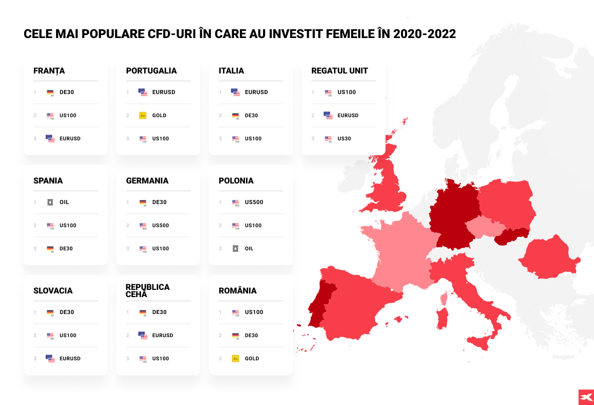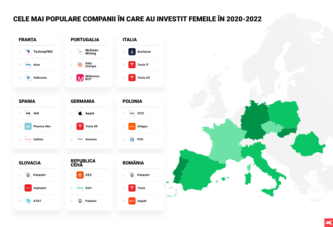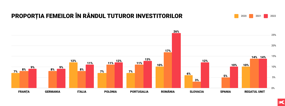 Cel mai mic procent de femei în rândul investitorilor este în Republica Cehă, Franța și Germania. Acestea sunt singurele piețe în care acest procent este, în prezent, sub 10%. De asemenea, în contextul unei volatilități majore pe burse, ponderea femeilor în rândul clienților noi a atins, în 2022, un nivel record, de 16%.