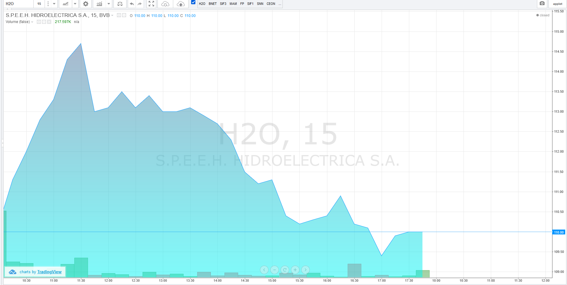 În prima zi de tranzacționare pe BVB, acțiunile Hidroelectrica au închis la prețul de 110 lei, adică au crescut cu 5,7% față de prețul oficial din oferta publică desfășurată de companie (104 lei) sau cu 9% față de prețul cu discount (100,88 lei) plătit de micii investitori în primele zile ale IPO-ului.