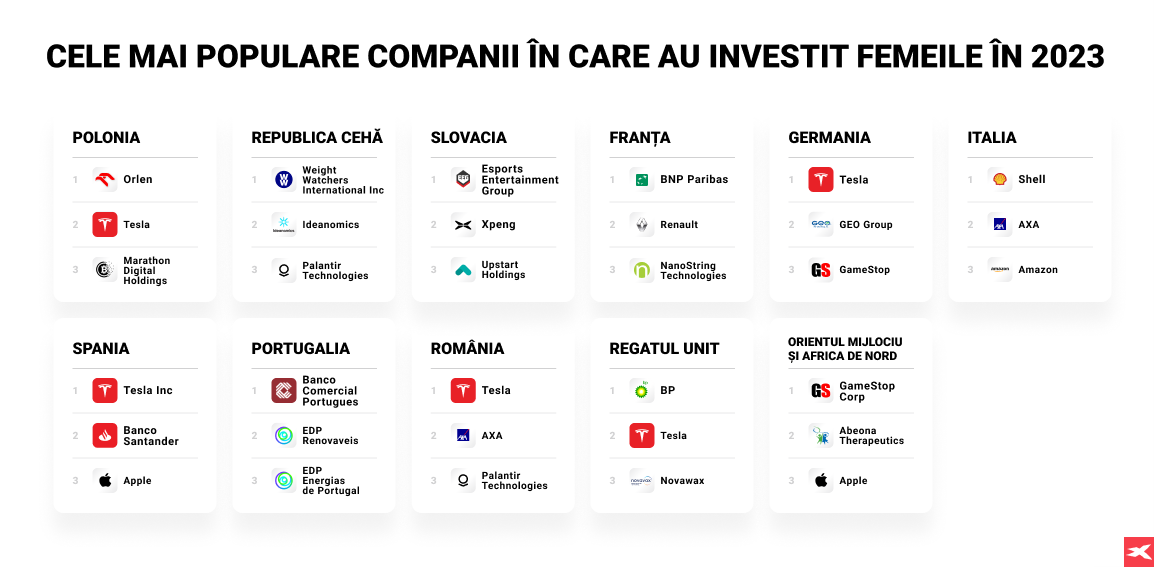 Dacă ne uităm la alte clase de active, femeile din România care investesc au avut o preferință pentru acțiunile cu expunere la piețele globale, cum ar fi: Tesla, AXA și Palantir Technologies.