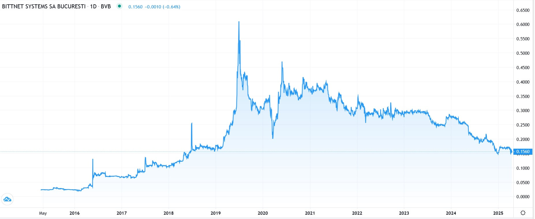 Evoluția acțiunilor Bittnet de la listarea la bursă și până în prezent. Sursa: Tradeville