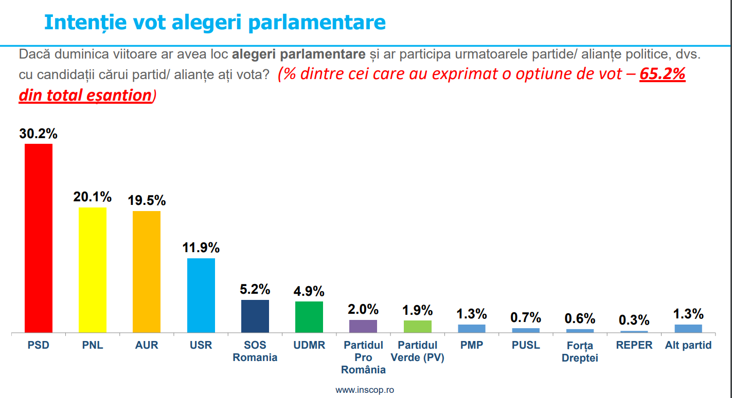 Raportat la cei care au exprimat preferința pentru un partid din listă, indiferent dacă declară că vin sau nu vin sigur vot (65,2% din total eșantion), 30,2% dintre români ar vota cu PSD, 20,1% cu PNL, iar cu AUR 19,5%. Pentru USR ar vota 11,9% dintre români, în timp ce SOS ar obține 5,2% dintre opțiunile de vot. Pentru UDMR ar vota 4,9% dintre cei care și-au exprimat o opțiune de vot, iar pentru Pro România 2%. 1,9% dintre cei intervievați își exprimă opțiunea de vot pentru Partidul Verde, 1,3% pentru PMP, 0,7% pentru PUSL, 0,6% pentru Forța Dreptei și 0,3% pentru REPER. 1,3% dintre respondenți își exprimă preferința pentru alt partid.