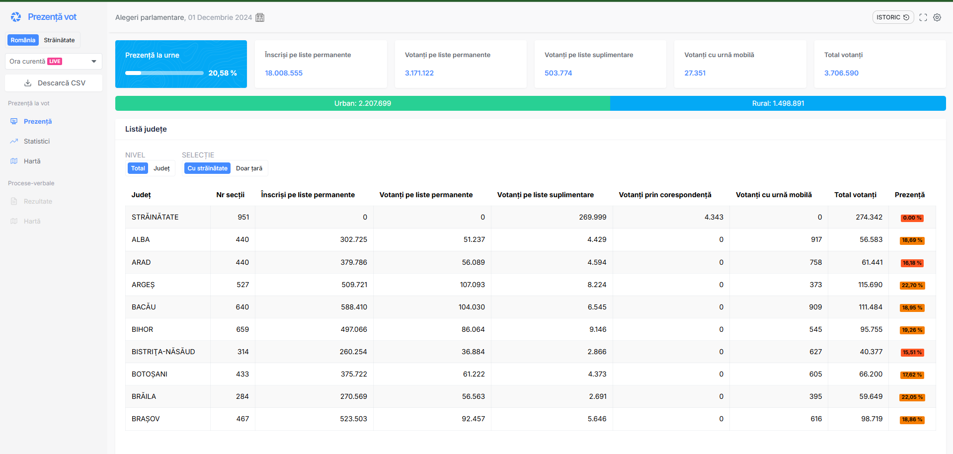 UPDATE 18:30: Peste 8,5 milioane de români au ieșit la urne, reprezentând aproape 50% din populație. Urbanul conduce ruralul la distanță mare, de peste 1.300.000 de voturi.
