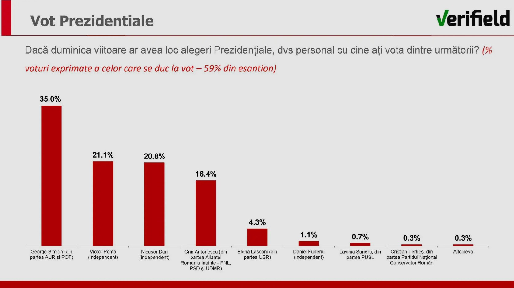 Candidatul PSD-PNL-UDMR în alegerile prezidențiale, Crin Antonescu, este cotat pe locul al patrulea cu 16,4% din intenția de vot, arată sursa citată. Elena Lasconi (USR), care a ajuns în turul doi al alegerilor anulate de anul trecut, este cotată cu doar 4,3% în sondajul realizat de Verifield.