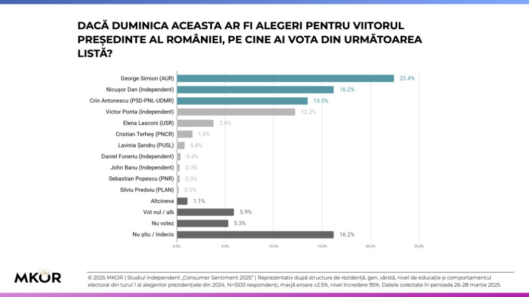 Un nou sondaj cu privire la alegerile prezidențiale îl poziționează pe George Simion în fruntea intenției de vot pentru turul 1 al alegerilor din luna mai. Acesta este urmat de către Nicușor Dan, pe a doua poziției, ultima poziție de pe podium fiind ocupată de Crin Antonescu. Găsiți mai jos detaliile din sondajul realizat de agenția MKOR.