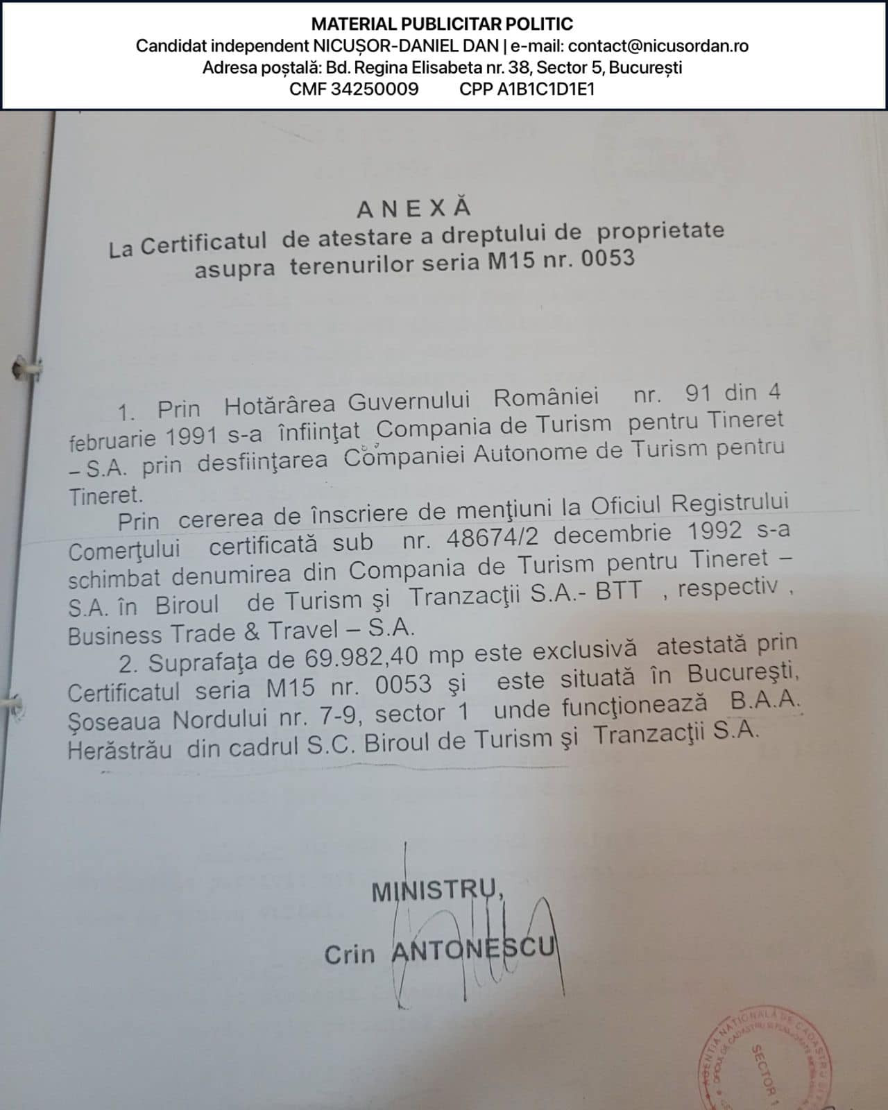 „Domnul Crin Antonescu cere documentele pe care de altfel i le-am arătat în dezbaterea de luni. Le fac publice și vă invit să judecați singuri. Ce dovedesc ele? Că domnul Antonescu a semnat, ca ministru, transferul unor terenuri către BTT, companie din subordinea ministerului pe care îl conducea. Și că mai apoi acele terenuri au ajuns la dezvoltatori imobiliari. Decizii ale Justiției arată clar că au fost ilegalități în aceste transferuri”, a scris Nicușor Dan pe pagina sa de Facebook.
