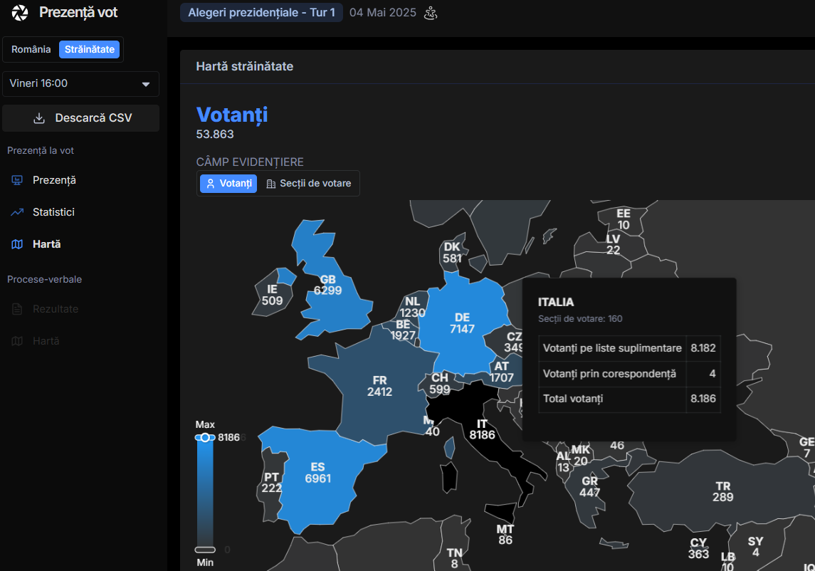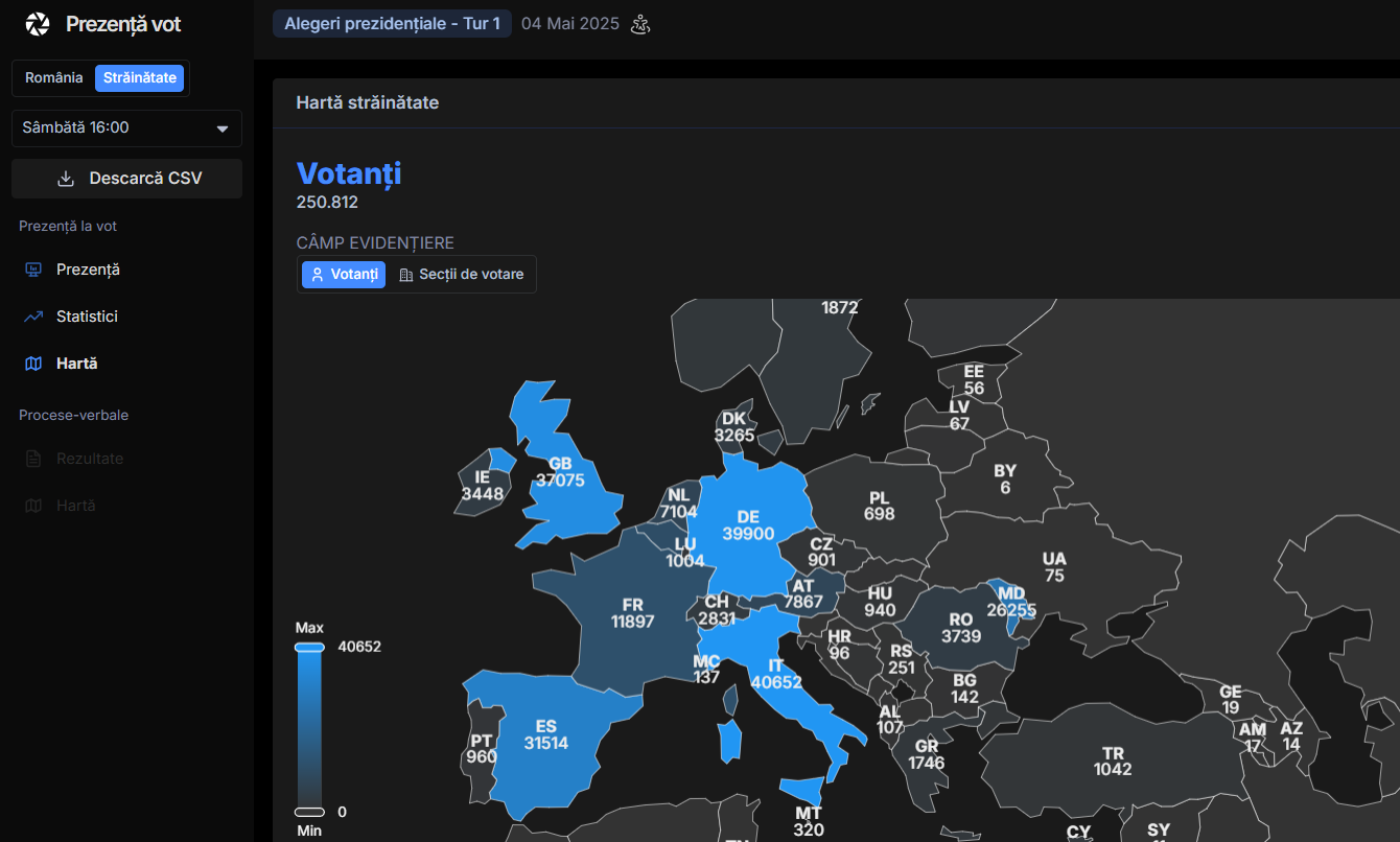 Conform datelor de pe AEP, până la ora 16:00 (ora României) în secțiile de votare din afara țării, dar și prin corespondență au fost contorizate deja 53.863 de voturi.