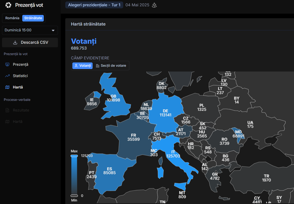Potrivit datelor actualizate pe platforma AEP, de la deschiderea urnelor, respectiv de joi seara, ora 22:00 ora României (ora locală 7:00) şi până duminică, 4 mai, la ora 15:00, s-au prezentat la urne 685.647 de cetăţeni români.