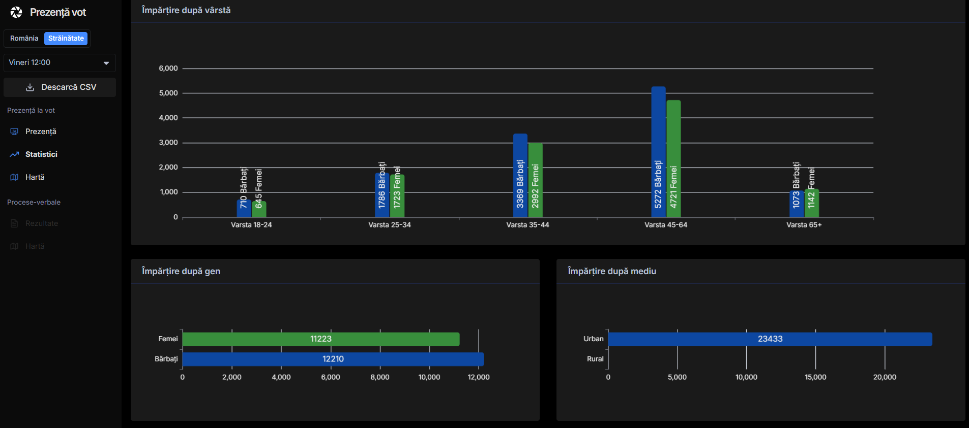 În ceea ce privește vârstele, cei mai mulți votanți sunt din categoria 45 - 65 de ani, urmați de cei din categoria 35 - 44 și intervalul 25-34 de ani.