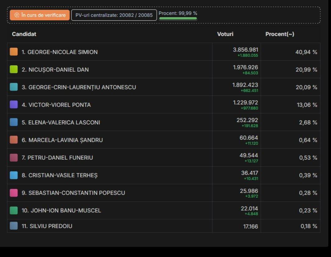 George Simion și Nicușor Dan vor intra în turul al doilea al alegerilor prezidențiale din 2025, în vreme ce Crin Antonescu, candidatul susținut de PSD-PNL-UDMR, nu a reușit să prindă finala, potrivit datelor transmise de către Autoritatea Electorală Permanentă (AEP), care numărase 99,99% din voturi.