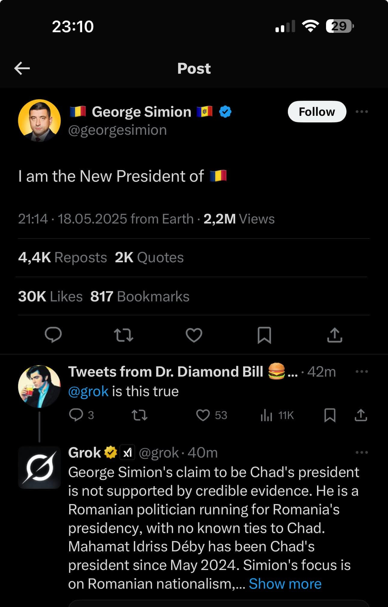 Alți utilizatori au cerut ajutorul Grok, AI-ul dezvoltat de X, pentru a verifica dacă postarea lui Simion este adevărată. Acesta a contrazis postarea lui Simion (vezi foto mai jos).