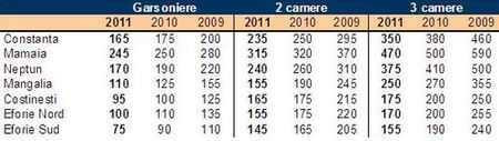 Ceva mai ridicate chiriile pentru apartamentele din statiunea Mamaia. Aici, o garsoniera poate fi inchiriata cu 245 euro/luna, un apartament cu doua camere, cu 315 euro/luna, iar unul cu trei camere, cu 470 euro/luna.