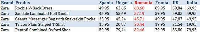 Analiza Wall-Street.ro ia in calcul cate cinci articole de la fiecare brand, Zara, H&M si Mango, in functie de preturile din Romania, Spania, Ungaria, Franta, Marea Britanie si Italia. Pe de alta parte, au fost analizate chiriile practicate in centrele comerciale din cele sase tari, potrivit datelor CBRE, cea mai mare companie de consultanta imobiliara la nivel global.