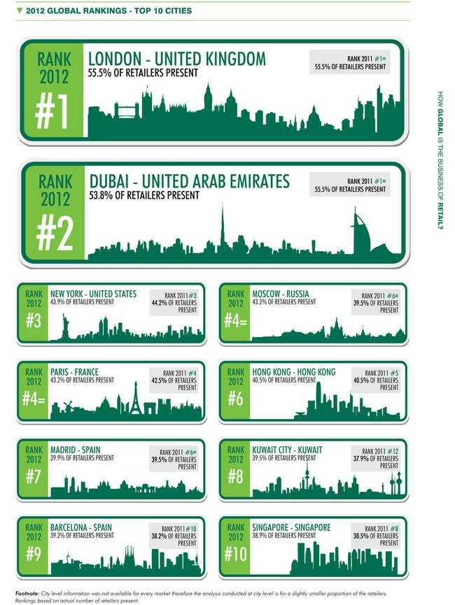 Cea mai puternica evolutie la nivel global o inregistreaza retailerii americani, 73% dintre acestia activand in toate cele trei regiuni, comparativ cu 44 % din retailerii din EMEA si doar 23 % dintre cei din Asia Pacific. Retailerii din sectorul produselor de lux si moda sunt cei mai dezvoltati la nivel global, cu o prezenta de 80% in cele trei regiuni.In afara Statelor Unite, retailerii americani prefera Londra (64,2 %), unde au cel putin un magazin, Dubai (61,2%) si Kuweit (49,3%). Retailerii din Europa prefera Orientul Mijlociu cand vine vorba de cucerirea unor noi piete. Dubai a fost cea mai populara destinatie in randul acestora, fiind preferata de 60,1%, urmata de Istanbul (48,6%), Kuweit (44,3%), Riad (44,3%) si Jeddah (42,1%).