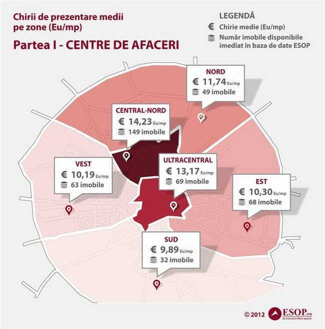 In zona ultracentrala a capitalei, chiria medie pentru un spatiu de birouri este de 13,17 euro/mp/luna, aceasta zona fiind urmata de nord, cu o chirie medie de 11,74 euro/mp/luna.