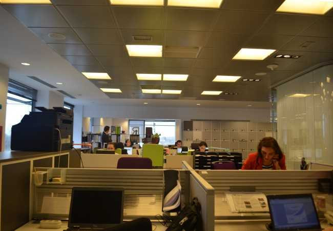 Imagine 2: In aceasta imagine vedeti spatiul de lucru pentru angajatii departamentului de vanzari. Birourile si scaunele inalte au fost gandite astfel pentru ca respectivii angajati lucreaza in medie patru ore pe zi la birou si in rest au intalniri cu clienti. Pentru ca acestia petrec mult timp in afara companiei, ei nu au un birou dedicat, ci ocupa locurile libere atunci cand isi incep programul de lucru. In plus, birourile inalte au fost alese si pentru acei angajati care vor sa lucreze uneori in picioare pentru ca studiile au aratat ca eficienta si productivitatea vin si cand muschii corpului sunt relaxati in afara statului pe scaun.