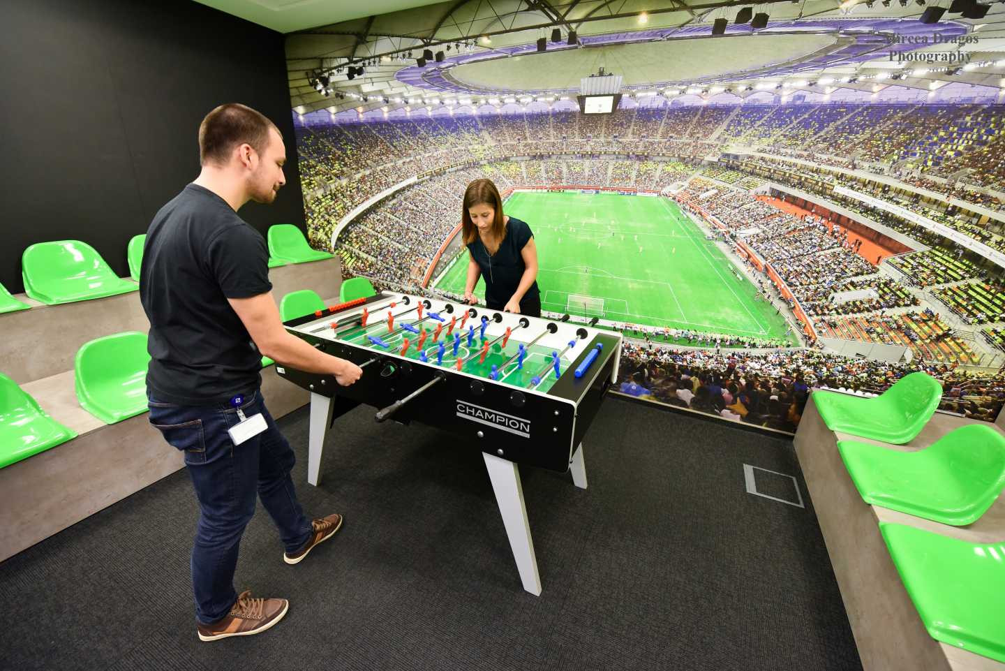 "In fiecare sala de proiect am creat o atmosfera distincta: in „Stadium” avem o masa de ping pong si fussball, conceptul „Mind Power” are la baza jocurile logice, iar barca din „Danube Delta” este autentica. Sala de proiect „Romania” are un decor inspirat din „Poiana lui Iocan”, toate obiectele traditionale de decor fiind realizate manual (razboi de tesut, leagan, cerga si altele). „Texas” este locul meciurilor de shuffleboard si air hockey, intr-un decor ce reproduce un salon texan din secolul trecut. „Japan” este, in prezent, cea mai populara sala de proiect datorita ambientului relaxant, care vine in sprijinul creativitatii. Obiectele de mobilier joase (mese, fotolii, scaune) si lampioanele creeaza un decor minimalist si o oaza de liniste, un adevarat ambient ZEN", a completat Popa.
