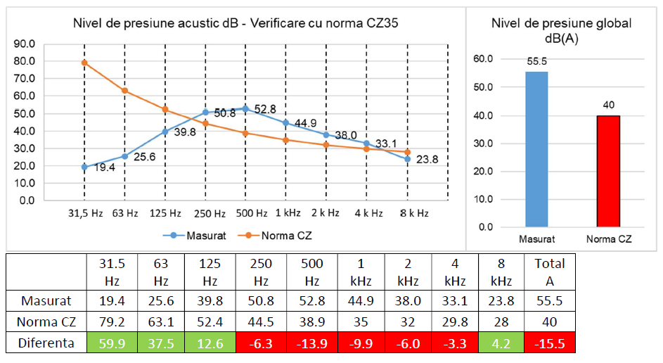 Verificarea nivelului de presiune acustică s-a realizat în peste 40 de puncte și s-au obținut multiple rezultate. În graficul de mai jos, se poate observă că începând cu frecvența 250 Hz până la 4000 Hz nu se respectă nivelul impus de norme. Nici nivelul de presiune exprimat în dB(A) nu se respectă.