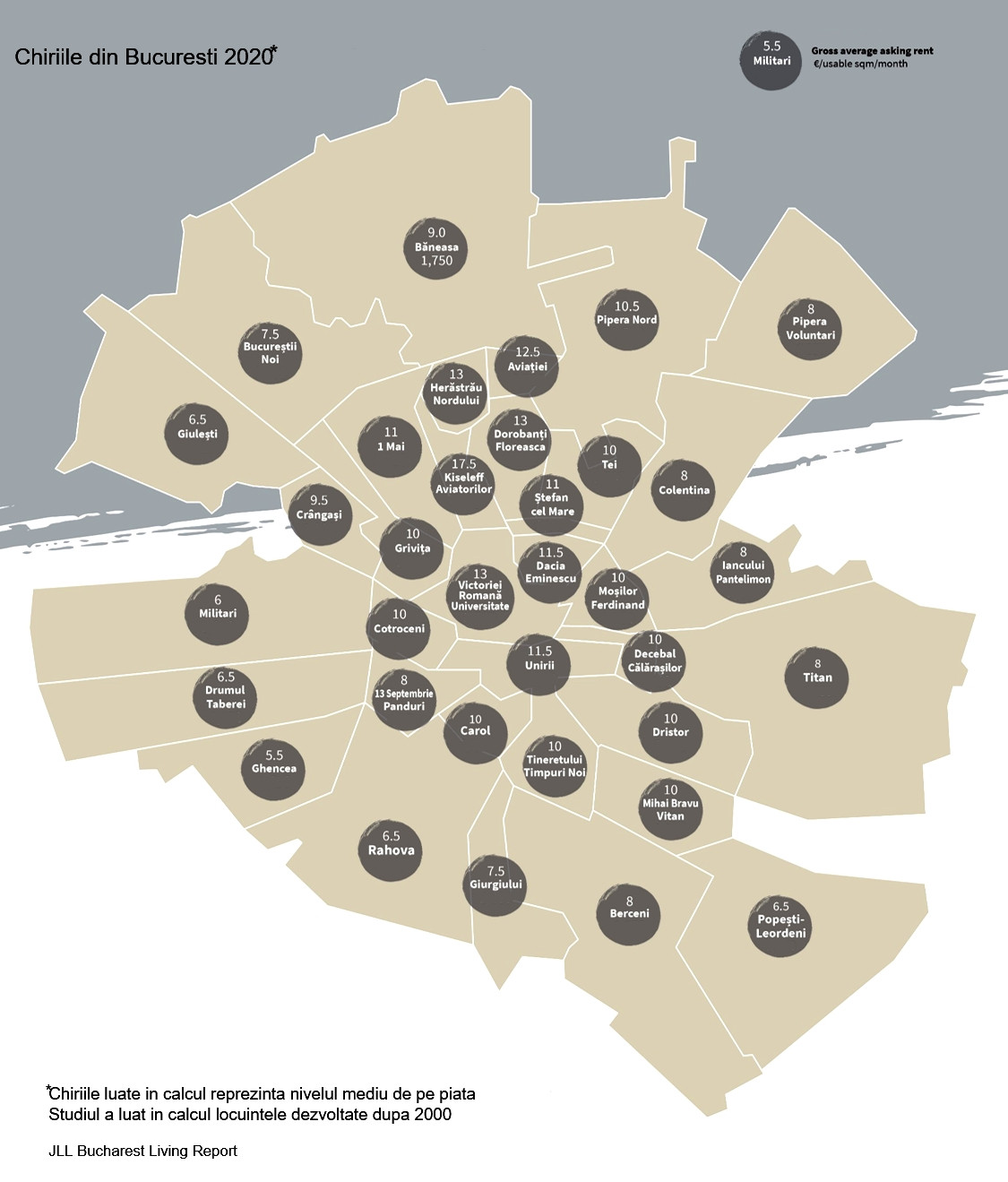 Nivelul chiriei lunare pe metru pătrat pentru proprietățile rezidențiale noi din București variază între 5,5 euro și 17,5 euro, cele mai ridicate fiind înregistrate la apartamentele aflate în zonele ultracentrale și de nord ale Capitalei, cu densitate redusă, precum Kiseleff - Aviatorilor sau Herăstrău-Nordului. În aceste zone, nivelul chiriei reflectă deseori gradul de confort și proximitatea de locul de muncă.