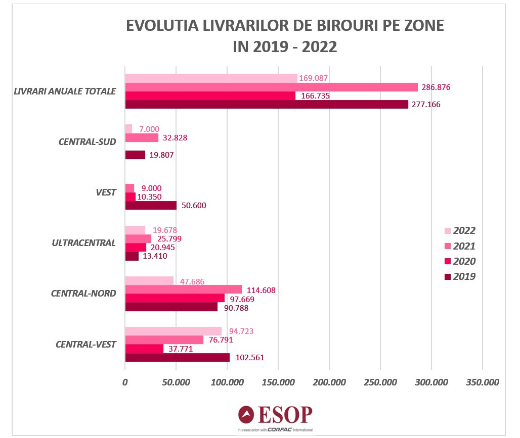 Evoluția livrărilor de spatii de birouri, înainte de pandemia Covid, în paralel cu cei doi ani de restricții, ne arată că livrările din acest an reprezintă un record pe piața din București, depășind anii 2019 și 2020.