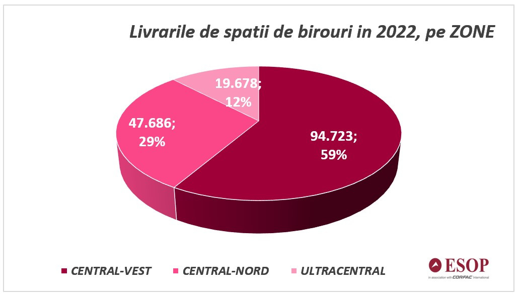 Pe locul doi în top se află zona Centru-vest (Politehnică, Orhideea, Cotroceni, Răzoare), cu un stoc de 679.597 mp și pe locul trei zona de nord (Pipera, Băneasa), cu 328.218 mp. În total, în București, sunt birouri moderne, de clasă A care totalizează peste trei milioane de metri pătrați, la sfârșitul lui 2021. La acestea, se mai adaugă un stoc de circa 800.000 mp de birouri de clasă B și B+.