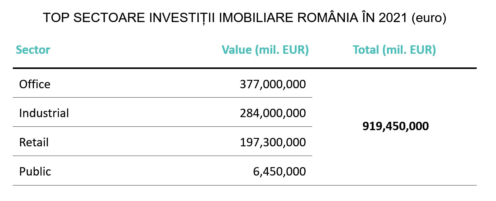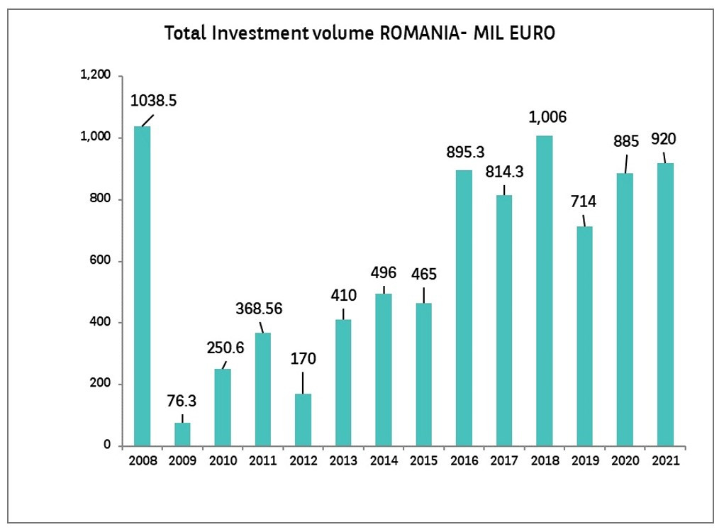 Potrivit unui studiu realizat de compania Fortim T.A., membră a Alianței BNP Paribas Real Estate, volumul total al investițiilor de pe piața imobiliară din România a fost de 919,45 milioane de euro în 2021, în creștere cu 4% față de anul precedent.