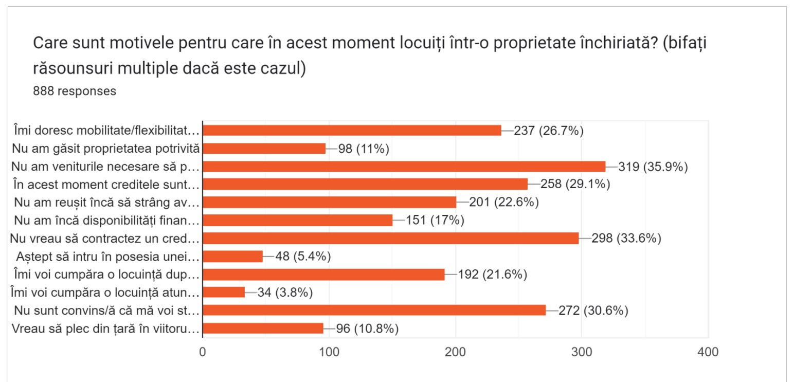 Principalele motive pentru care românii aleg să locuiască ȋn chirie sunt: nu au veniturile necesare pentru achiziția unei locuințe (35,9%), nu ȋși doresc să contracteze un credit imobiliar pe termen lung (33,6%), consideră nivelul dobânzilor mult prea ridicat (29,1%), nu au strâns avansul necesar achiziției (22,6%), au ȋn calcul cumpărarea unei proprietăți atunci când ȋși vor ȋntemeia o familie sau vor avea un copil (25,4%). 10,8% dintre respondenți spun că au ȋn calcul mutarea ȋntr-o altă țară.