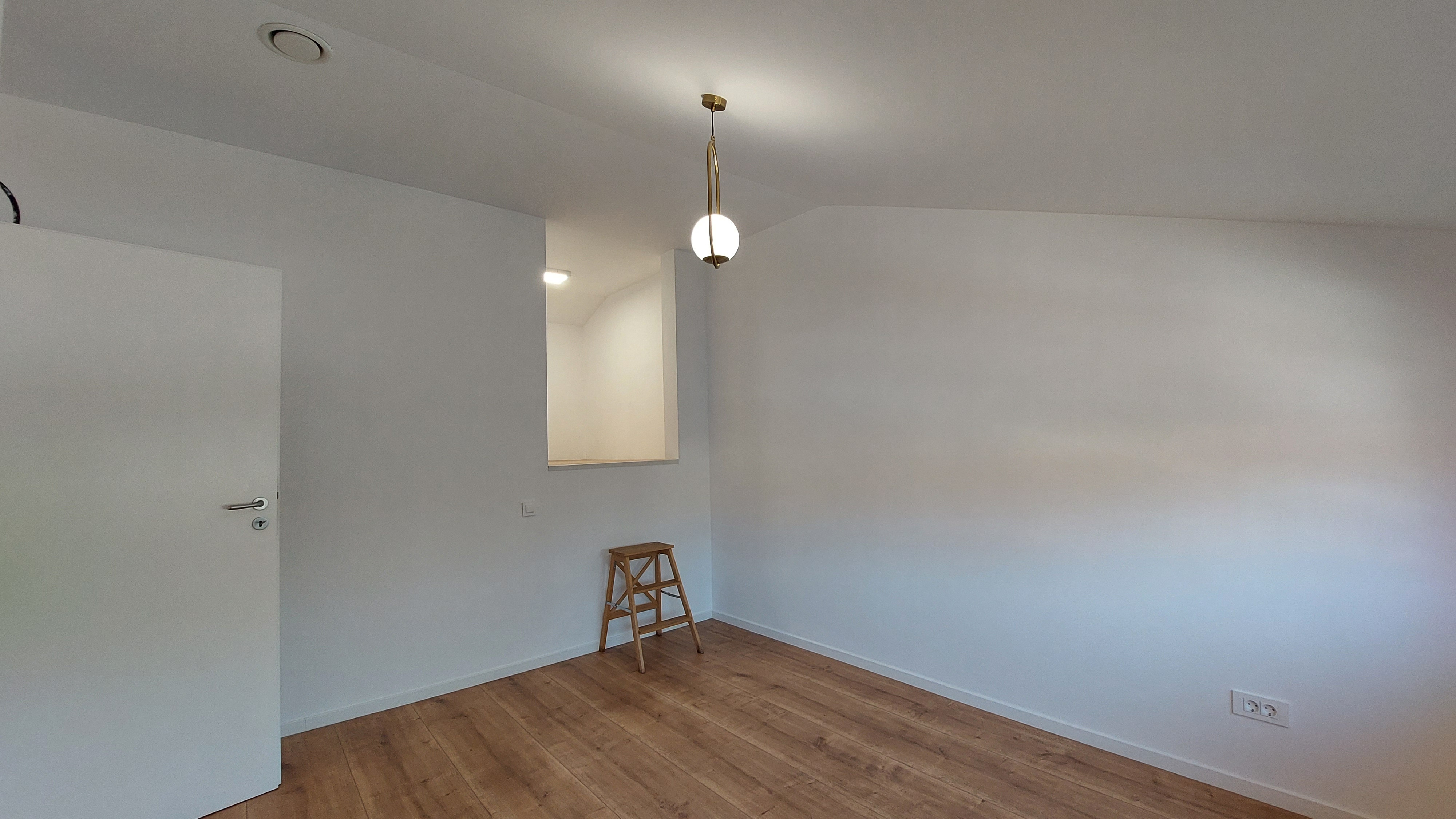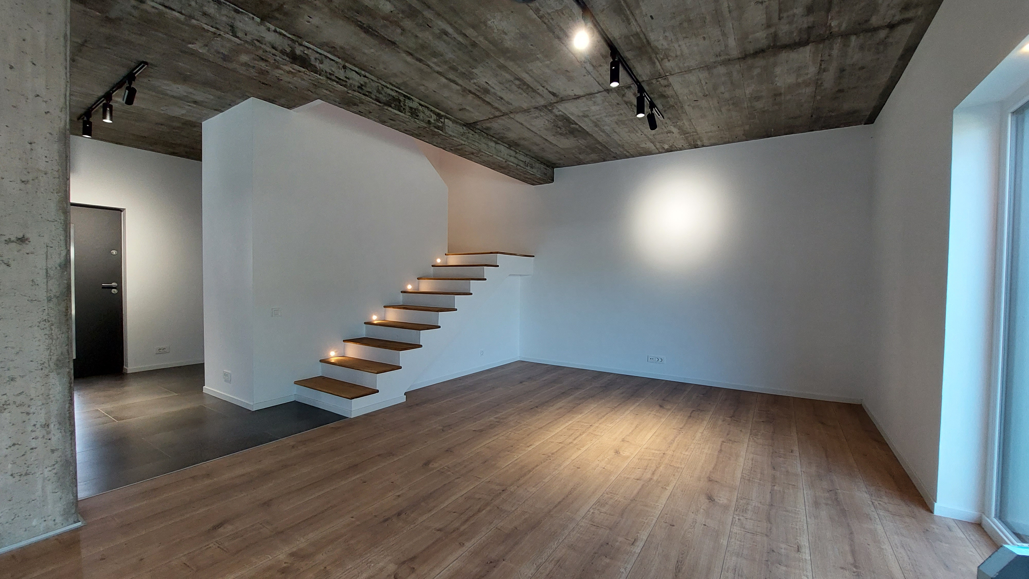 În mijlocul parterului se află casa scării, sub care se află locul pentru pompa de căldură, la parter, iar la etaj, deasupra ei, în unul dintre dormitoare a fost creat și un spațiu de depozitare, care ar putea fi transformat într-un loc în care să doarmă cei mici, un soi de pat suspendat, dar care apare ca o adâncitură în perete.