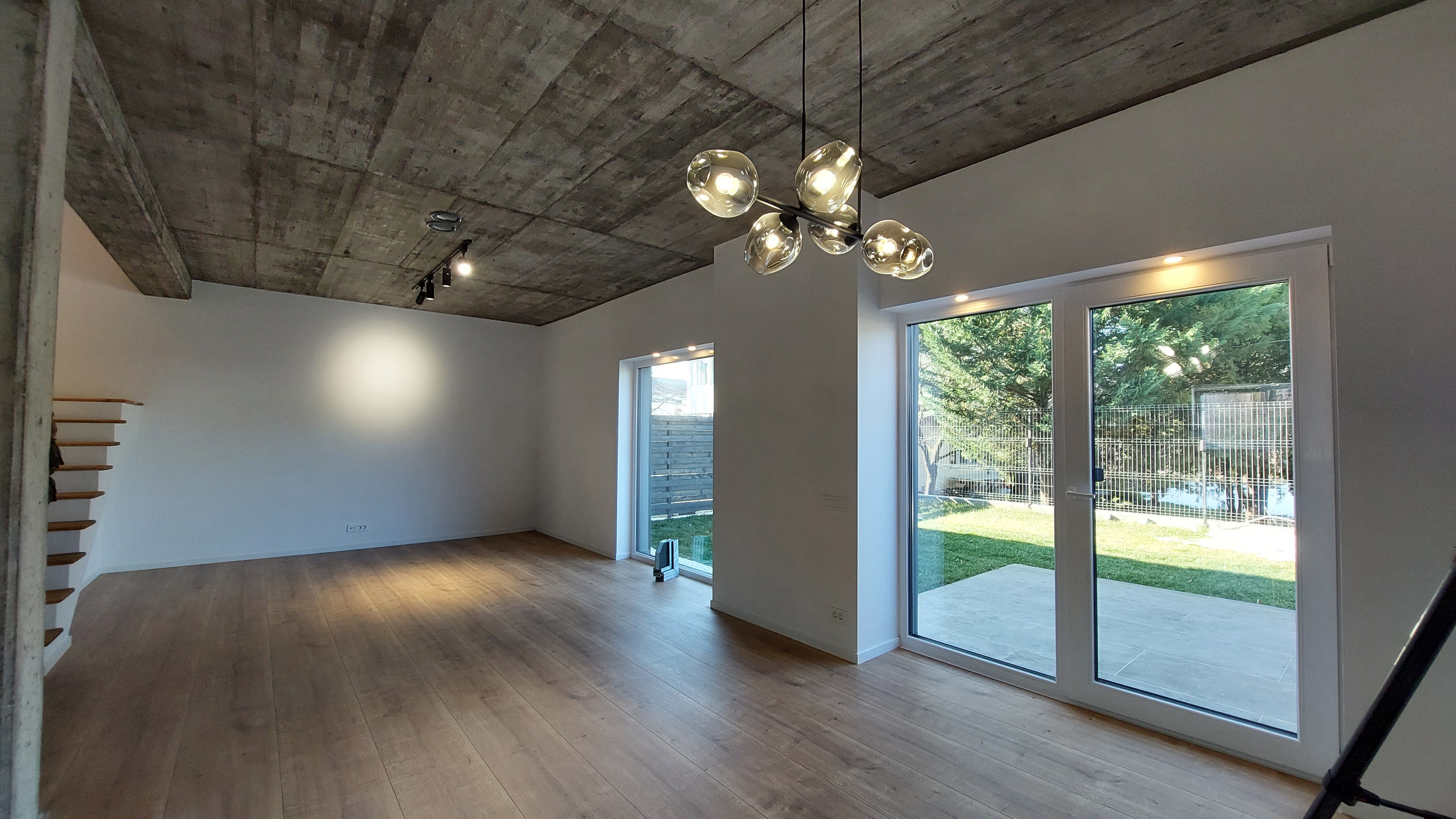 Vorbim aici de o locuință cu o suprafață medie de 150 mp, dispusă pe două nivele, cu living și bucătărie la parter și trei dormitoare la etaj.