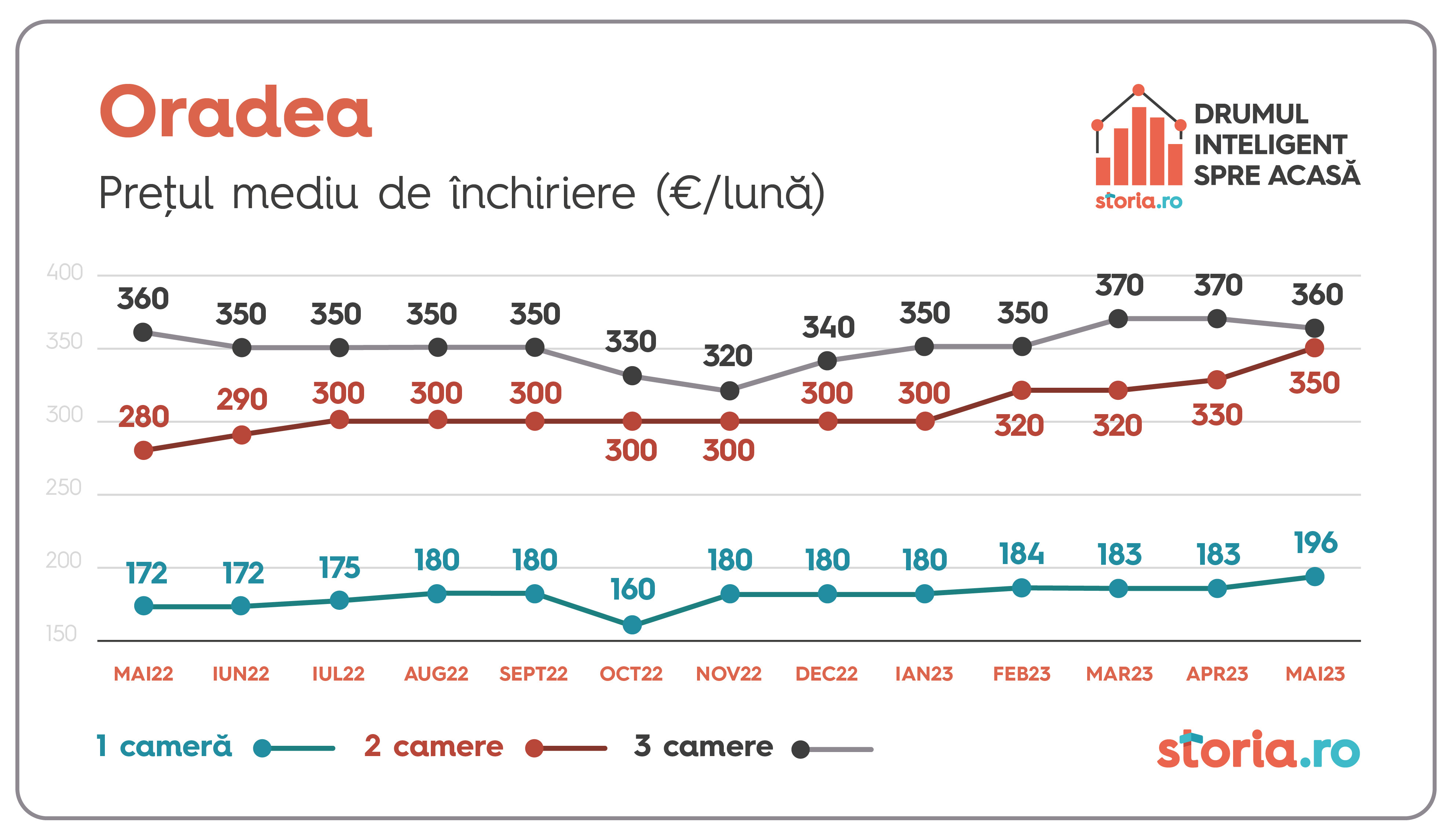Prețurile medii solicitate în Oradea au crescut cu 6% la apartamentele cu două camere și cu 7% la garsoniere. În același timp, prețurile medii pentru apartamentele cu trei camere au scăzut cu 3%. Față de anul trecut, în Oradea prețul mediu solicitat de închiriere este cu 27% mai ridicat.